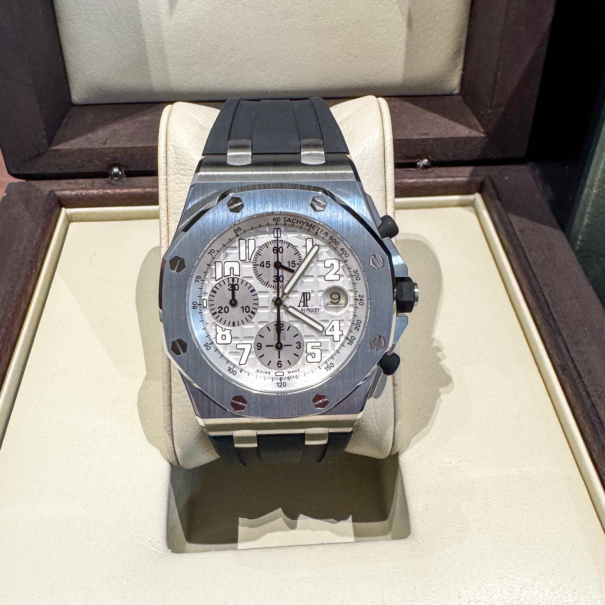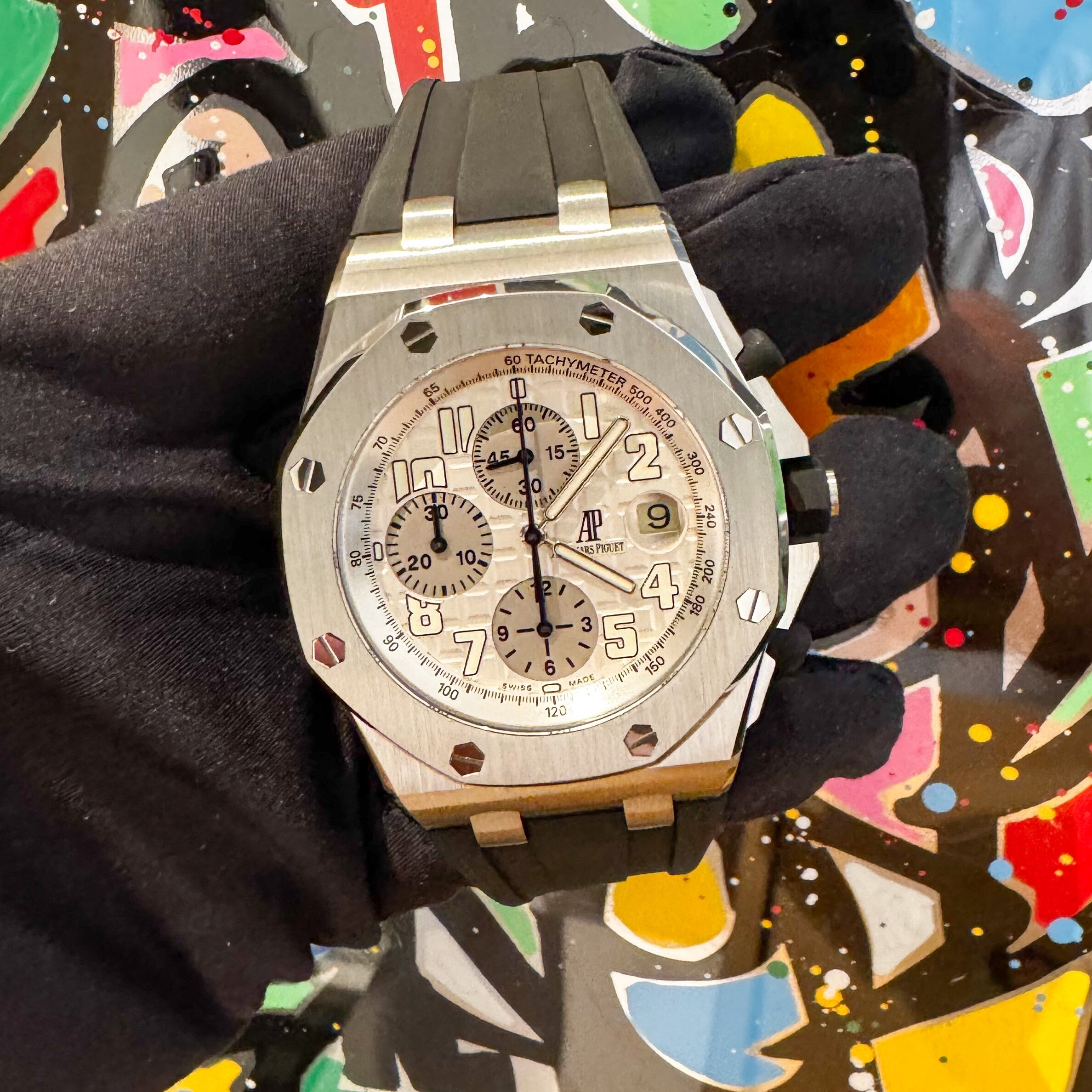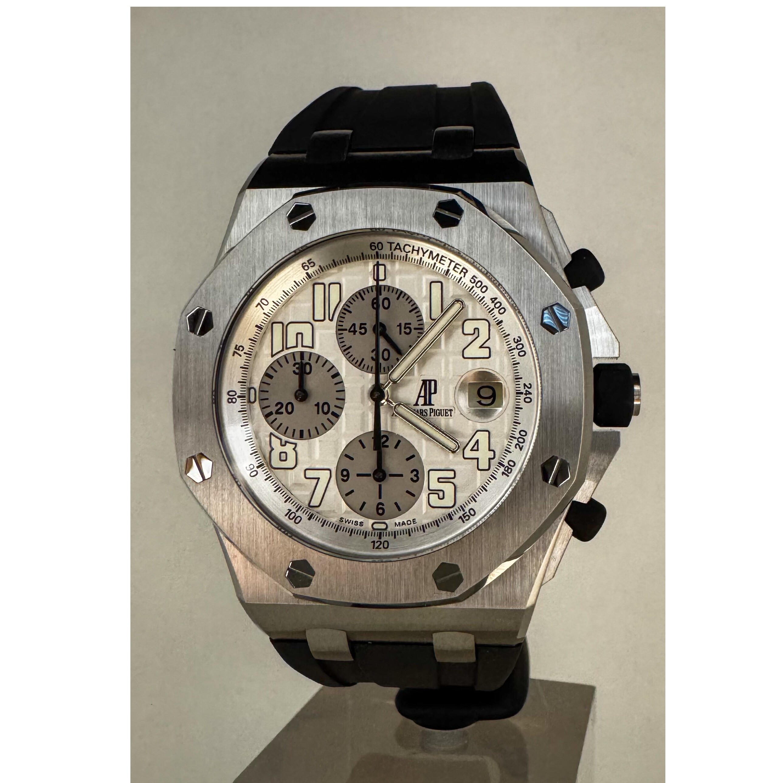Berenger.fr vous présente montre d'occasion sur Marseille de la marque Audemars Piguet modèle Royal Oak Offshore en acier de taille de boitier 42 mm, référence: 26020ST.OO.D001IN.01.A