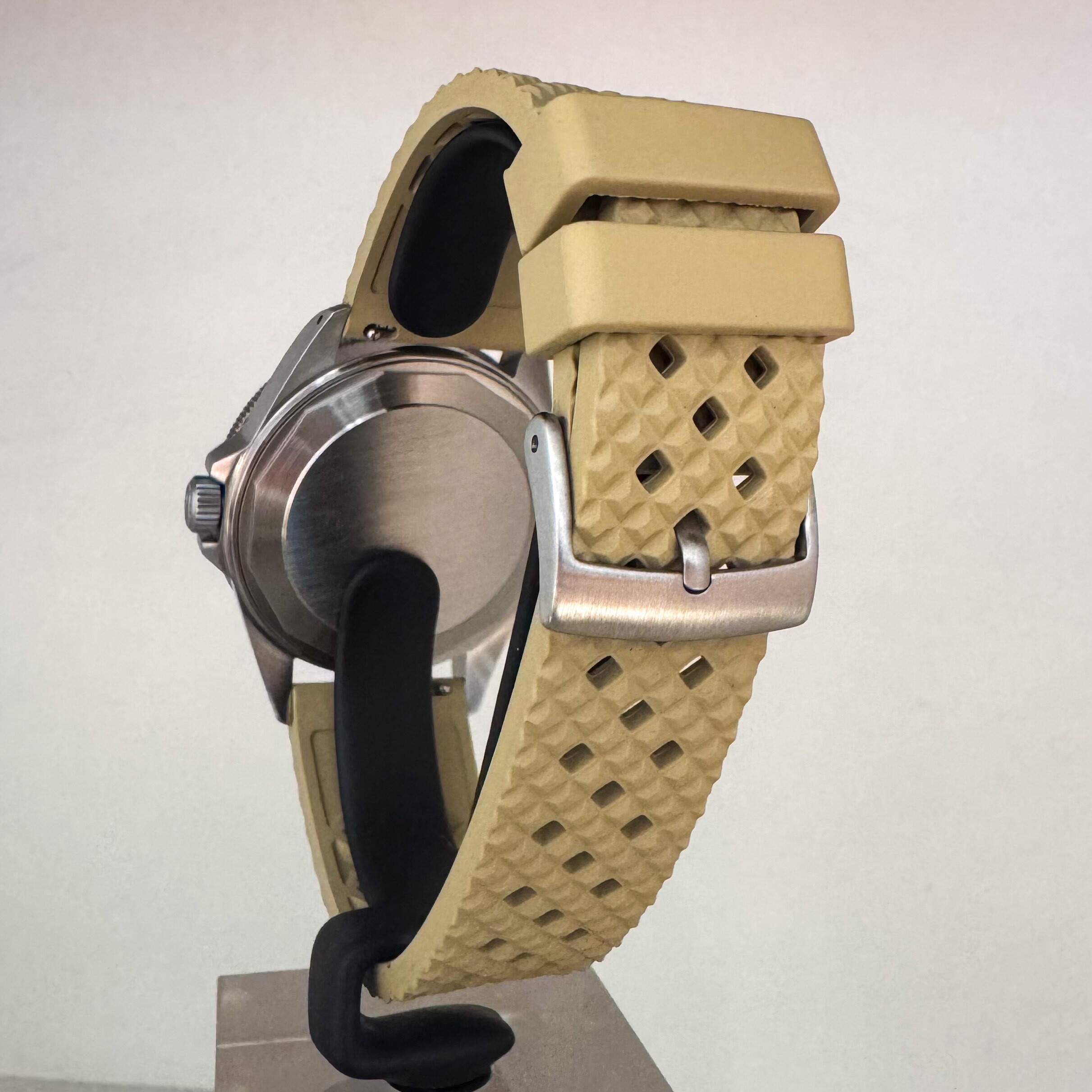Elle est livrée sur son bracelet caoutchouc d'origine avec sa boucle ardillon en acier.