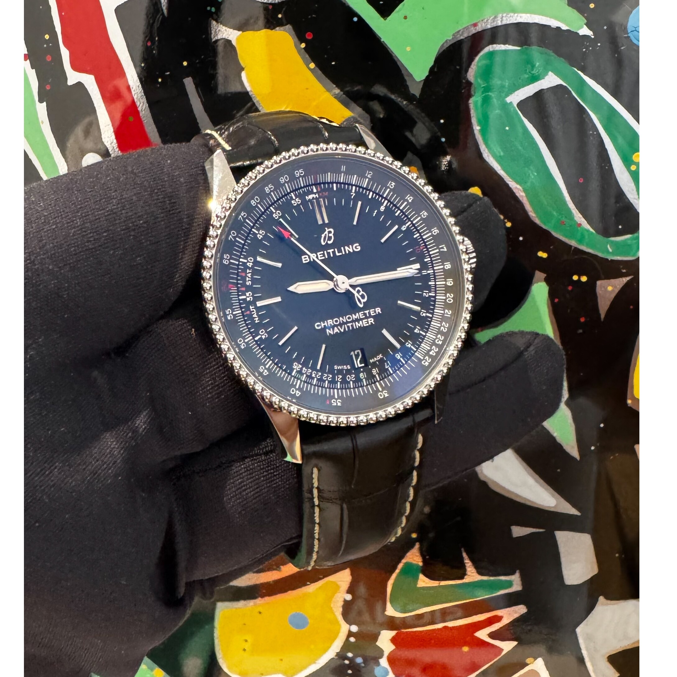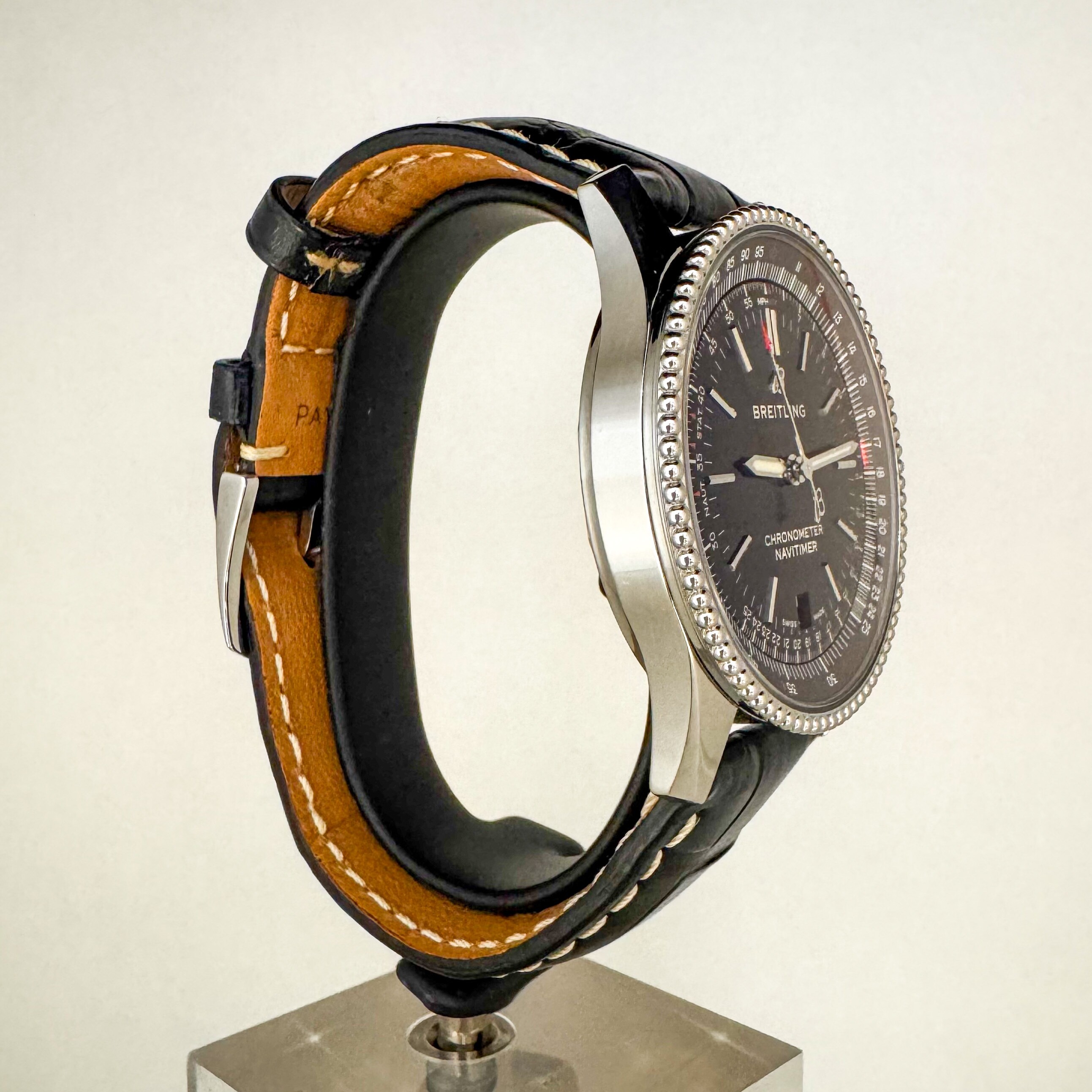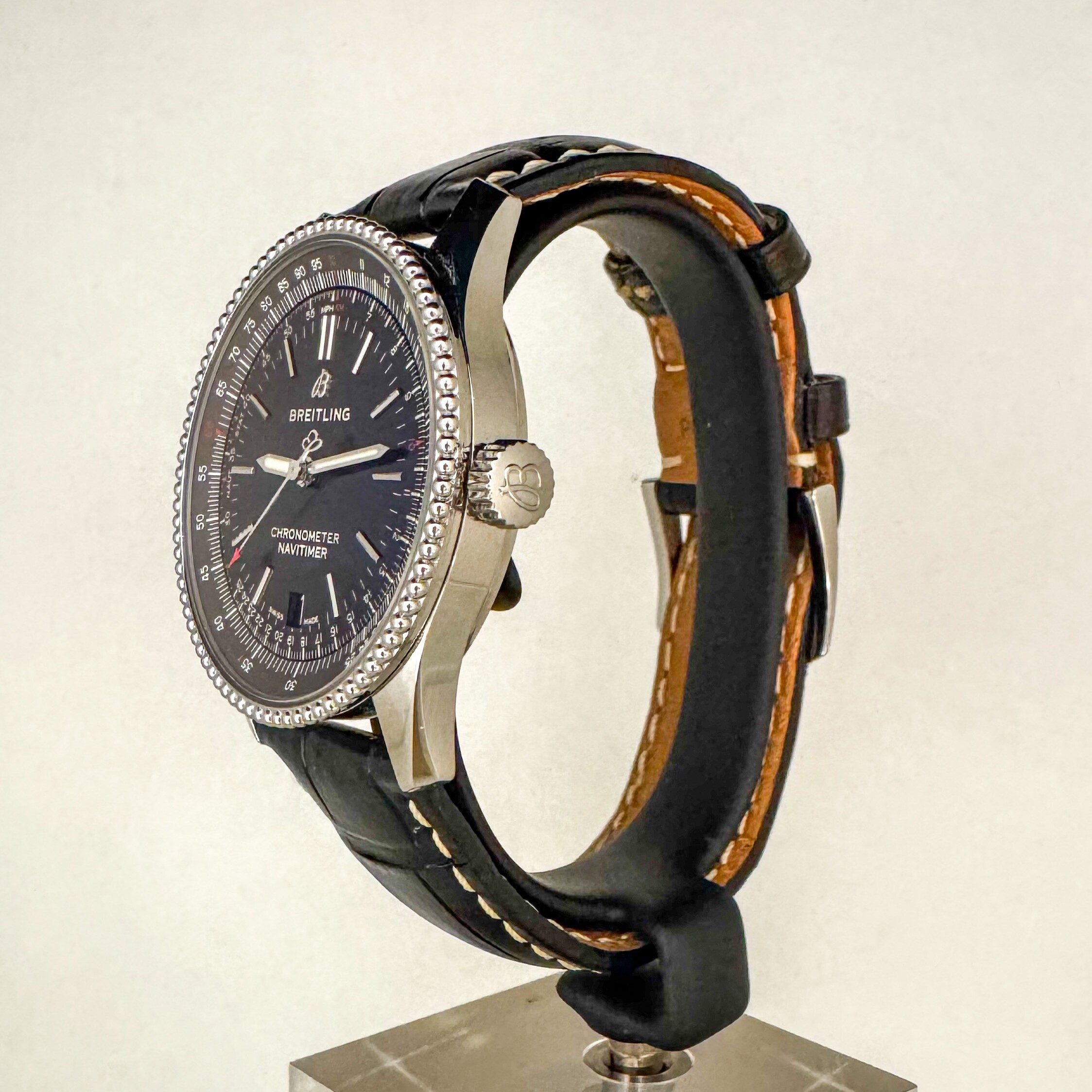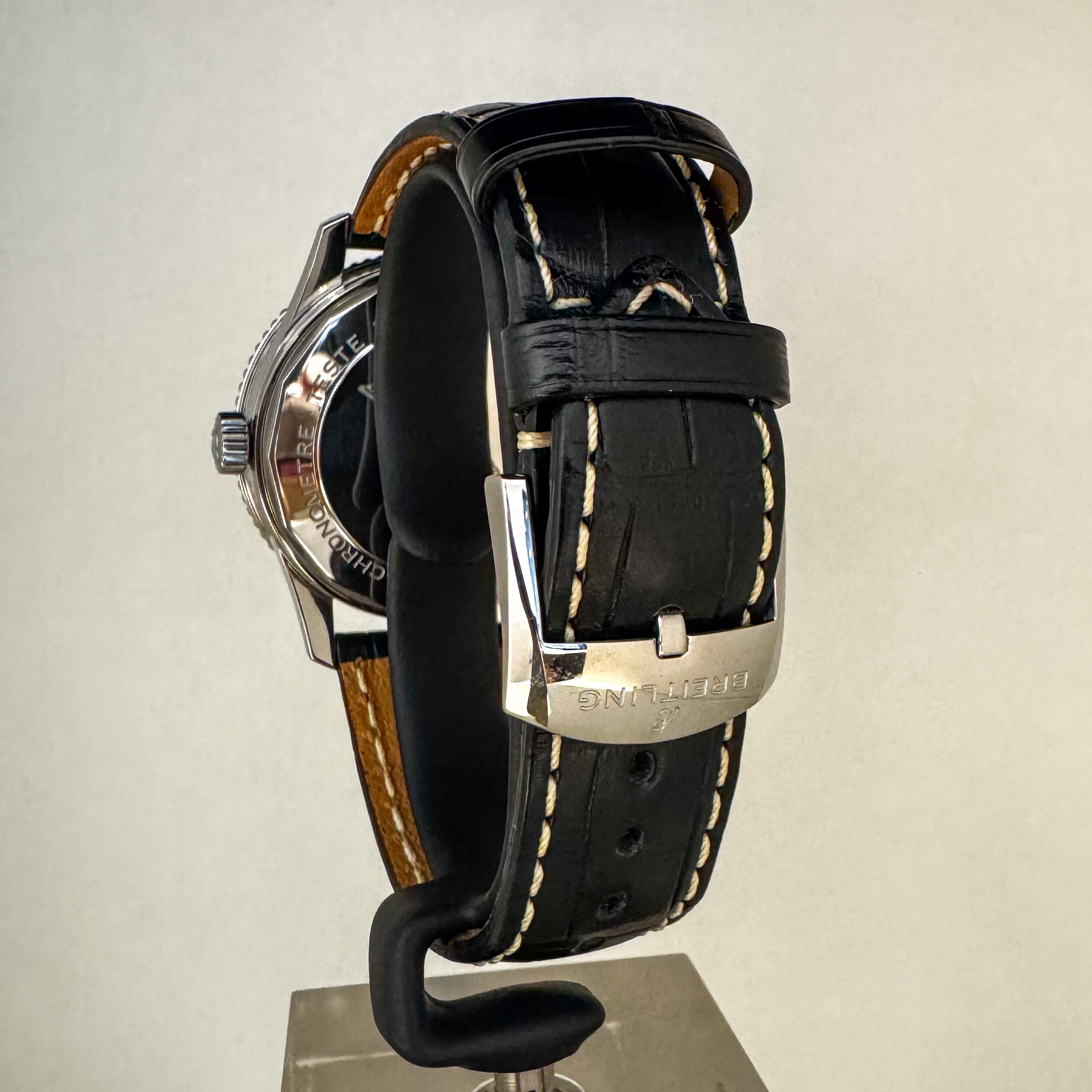 La montre est en très bon état général sur son bracelet en cuir Breitling d'origine avec sa boucle ardillon en acier.