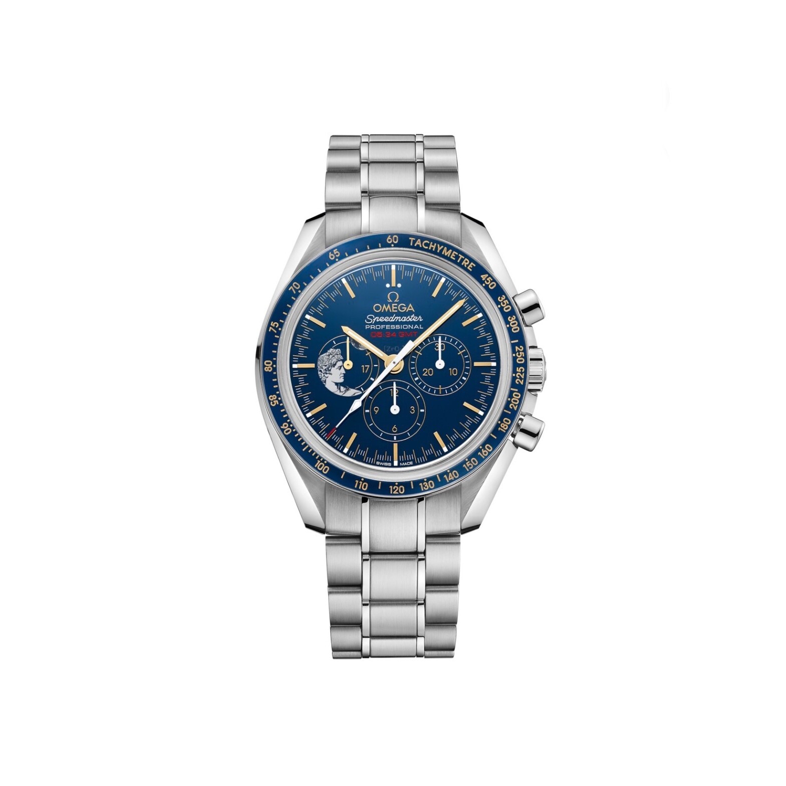 Son boîtier de 42 mm en acier inoxydable est cerclé d'une lunette en céramique bleue polie présentant une échelle tachymétrique en Ceragold™ OMEGA.