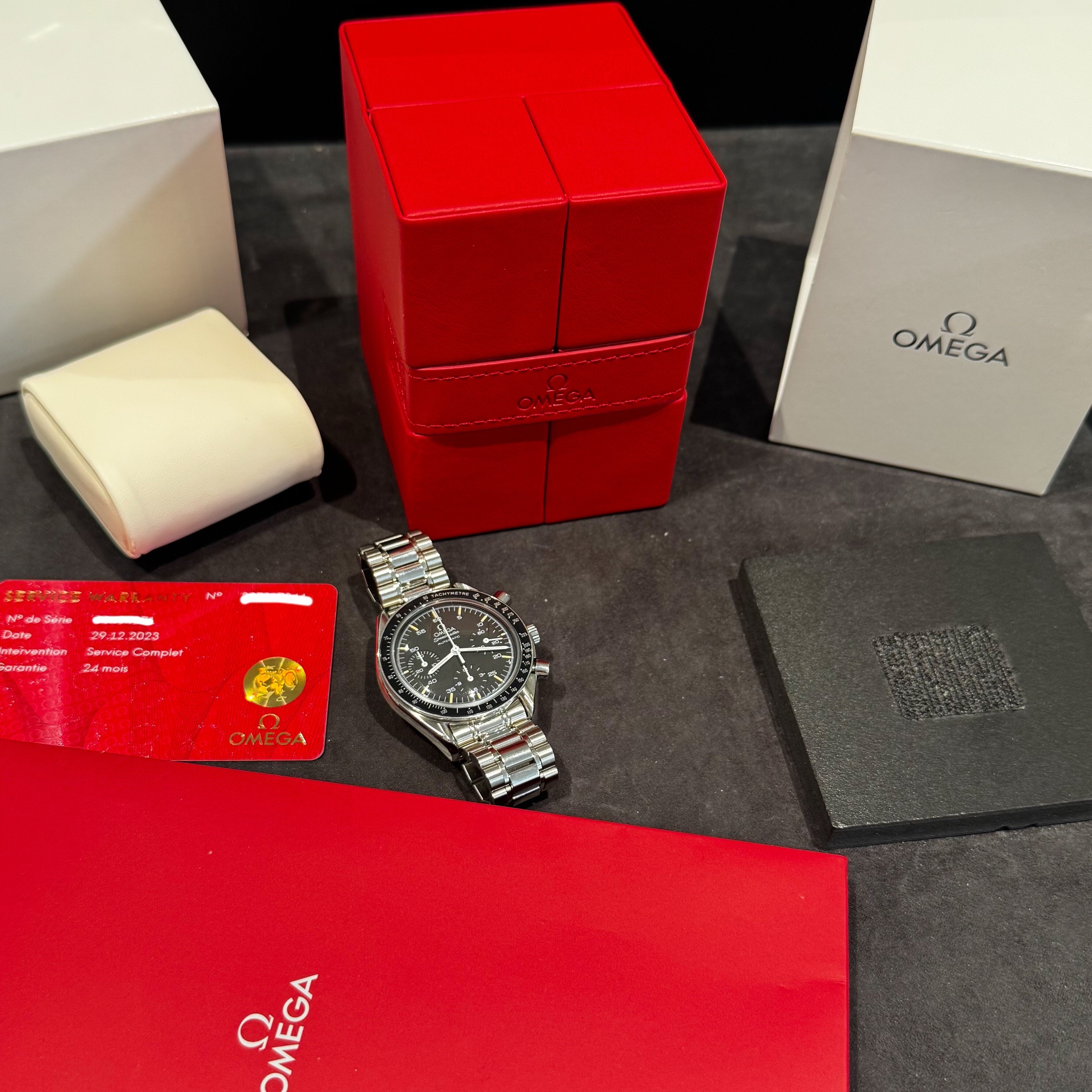 Elle est livrée avec une boite de service Omega et son service complet Omega du 12/2023.