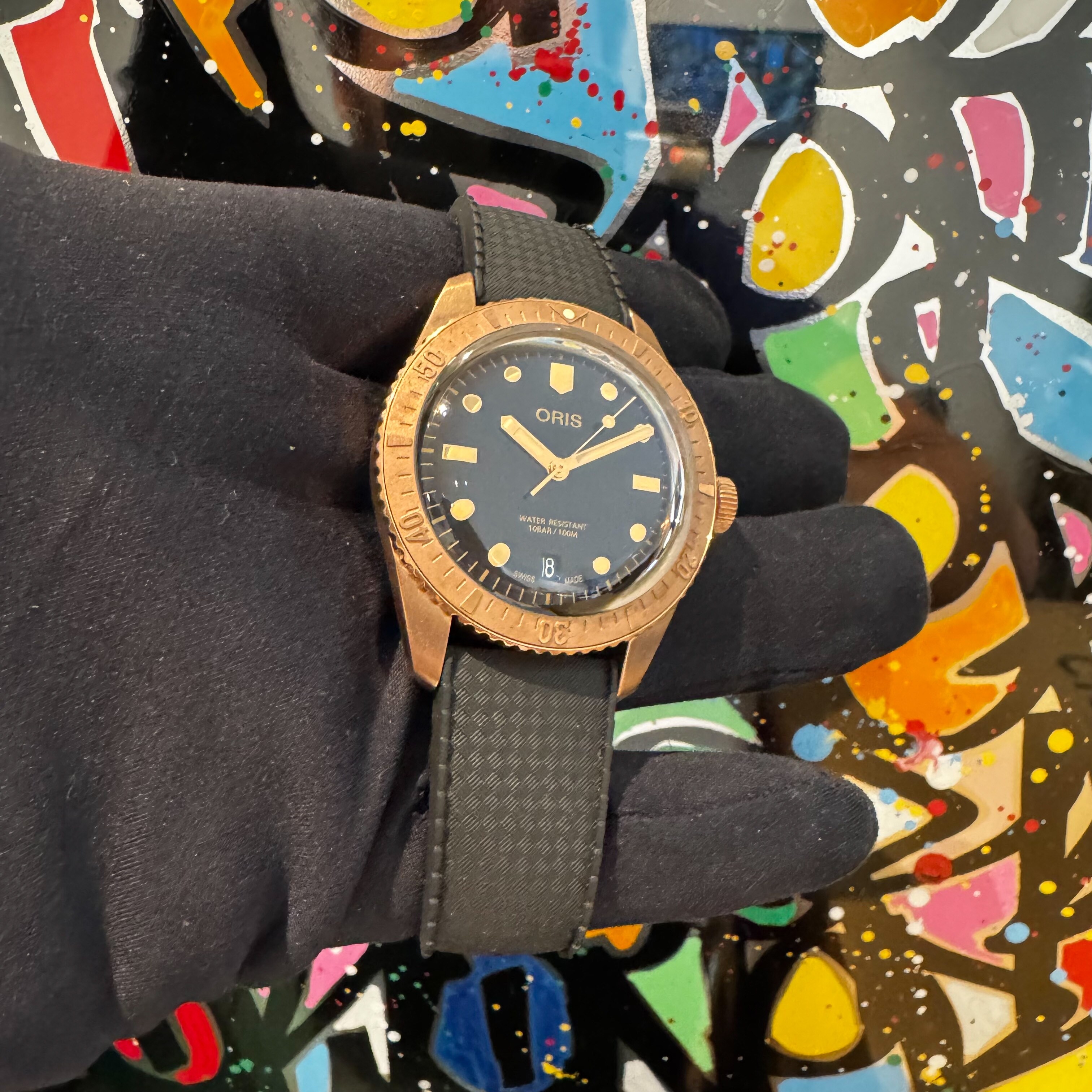 La montre est en état quasi neuf sur son bracelet en caoutchouc avec sa boucle ardillon Oris d'origine.