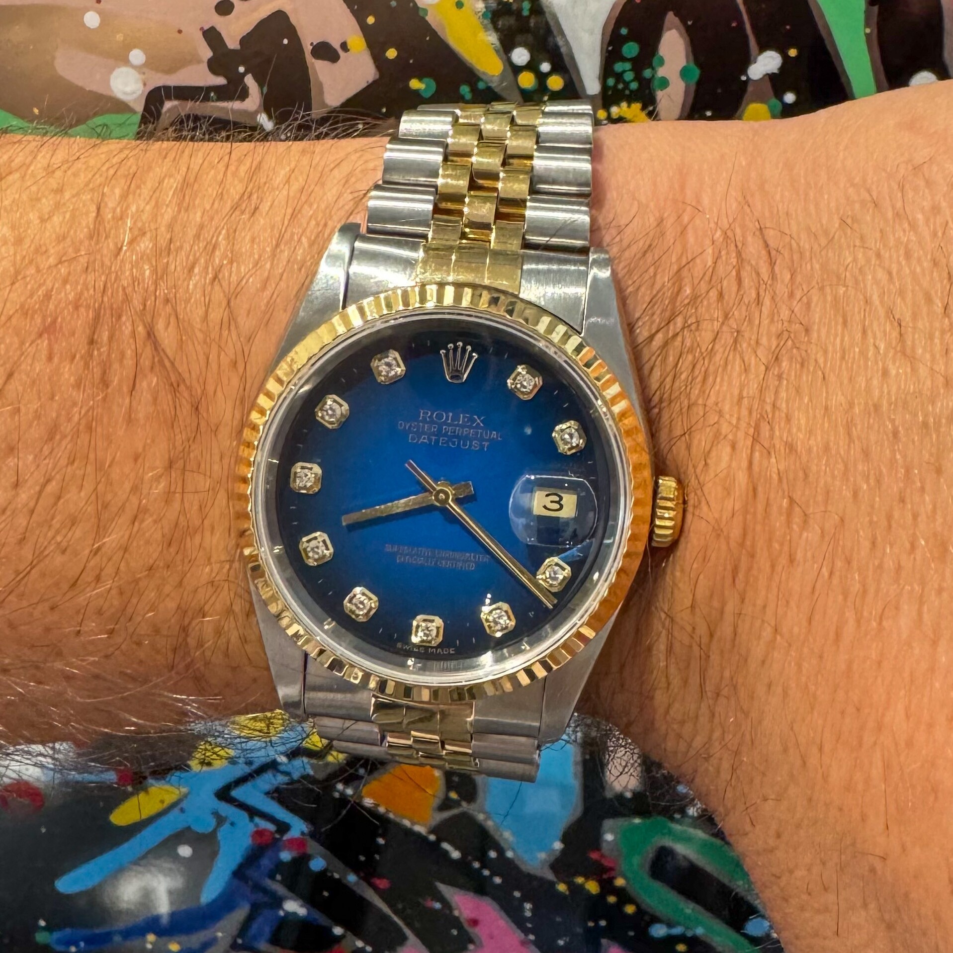 A noter son superbe et rare cadran vignette Blue avec ses diamants.
